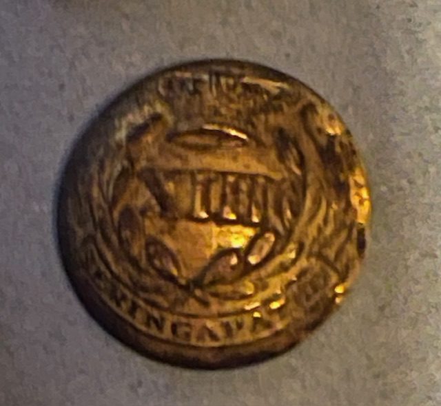 The officer’s 16mm gilt button of the 13th Madras Native Infantry showa the regimental number XIII within a laurel wreath with a crown above and he battle honour SERINGAPATAM on a scroll below. The button has a closed back with a single air hole but with no backmark. This the size of button that may have been worn on the stable jacket or on the collar of the coatee. It ooks as though it could do with cleaning but retains a good deal of the original gilt finish. mar13/2 SOLD 13th March 2026