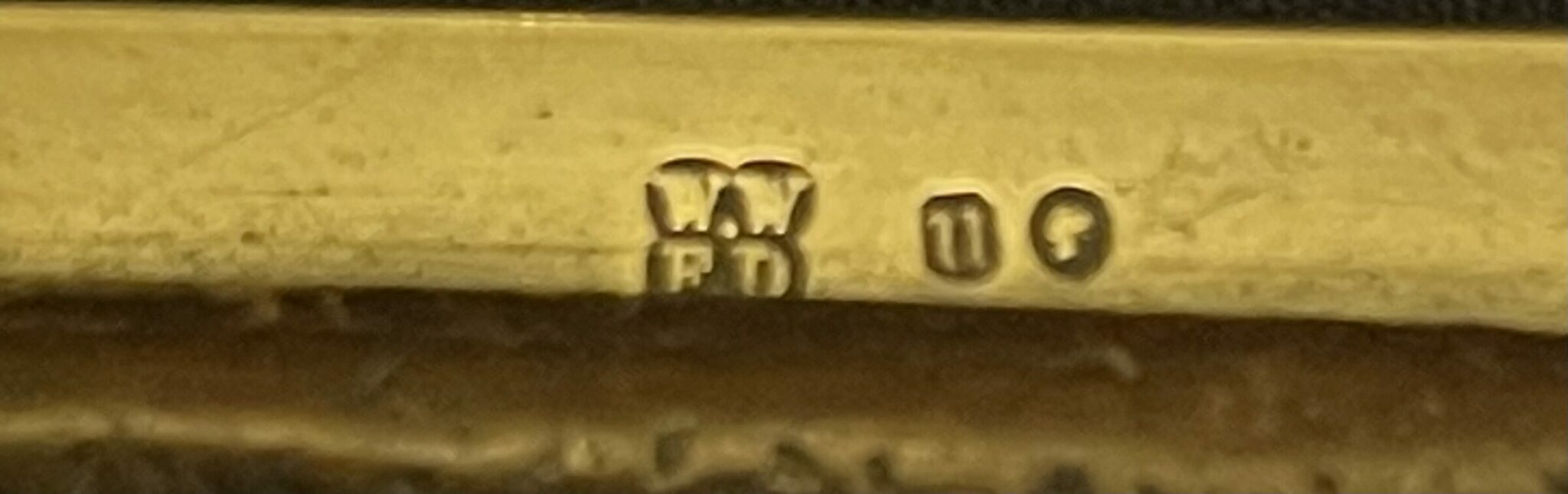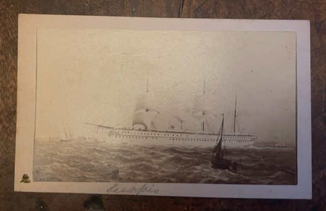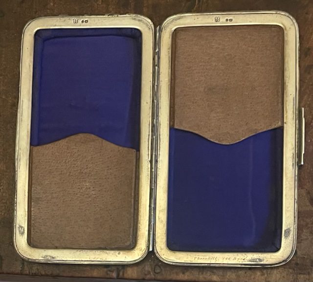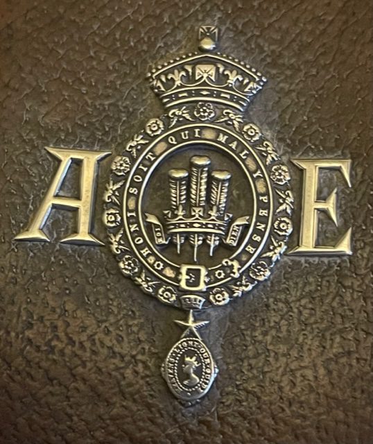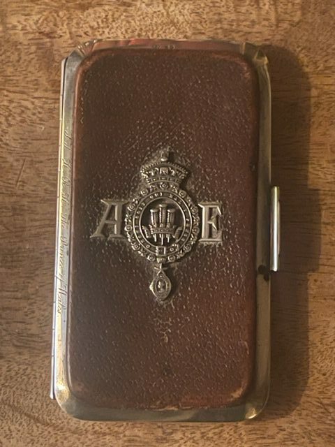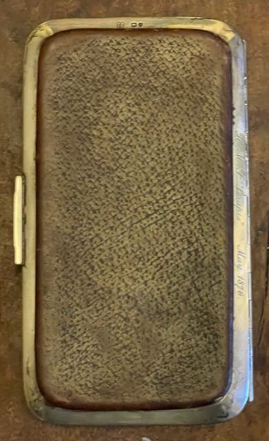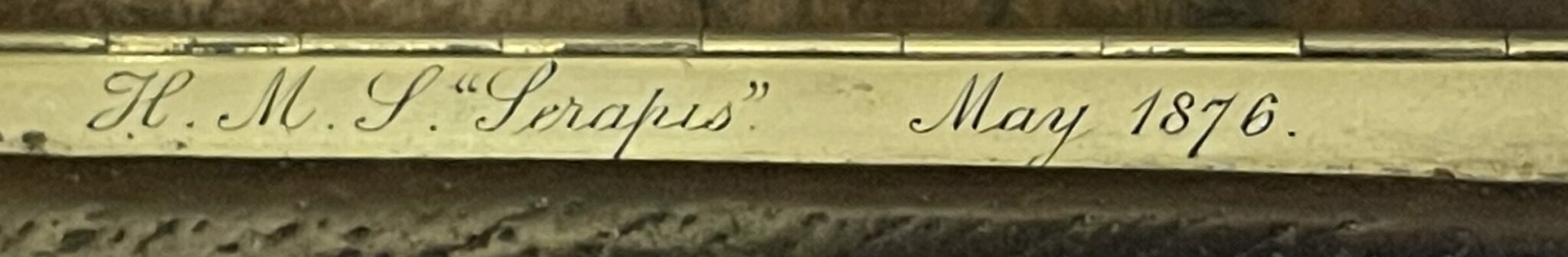 Prince of Wales [later King Edward VII]. A gentleman’s cheroot case of brown leather with silver fittings and mounts. The case, 6 x 3¼ ins [15 x 8.5mm] is silvder mounted with the Prince’s badge to the front, his vrest within a Garter and Garter Chain, the Imperial Crown above w9ith the pendant Order of the Star of India. His initials A E to the sides [ ratherr as it appears on the binding of the book William Howard Russell:The Prince of Wales’ Tour of a Diary in India]. The silver mounts are hallmarked London 1875 maker WW HF and a lower interior mount is engraved by the maker Thornhill 144 Bond Street . The mounts, multipart hinge, spring catch, and purple silk lining are all in good condition with just a few dark mounts on parts of the silver. The upper hinge mount is engraved d.d. H.R.H. The Prince of Wales [d.d. Latin abbreviation for a gift]. The lower mount is engraved H.M.S. “Serapis” May 1876 .The leather which allowed the case to expand a little shen cheroots were put in it has dried out somwehat with age and I have not tried to force it to open further. Included in this sale is a carte de visite by Symonds &Co. 39 High Street Portsmouth. This sort of gift would most probably have been given to a senior officer on the Serapis in gratitude for the lengthy voyage successfully made but I doubt whether there would be more than a handful. I have not seen another. Although we have no definite provenance we acquired this with a photograph of an officer of the Serapis and there could be a link. dec23/1