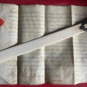 George V. Admission card allowing admission to the Quadrangle. Buckingham Palace on the occasion of an Investiture by H. M. The King. Printed white card 5 x 3¾ ins with embossed tudor crown top let in red. Added by stamp is the date in July 1918, the last summer of the 1st World War.   jul4/7