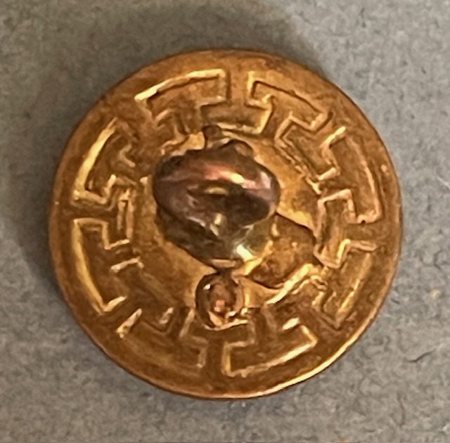 The 15mm officer’s mess dress button shows the regimental badge [known as the Golden Galley] mounted in silver on the flat gilt button. The backmark is a decorative design. Somewhat rubbed on the high points of the design.