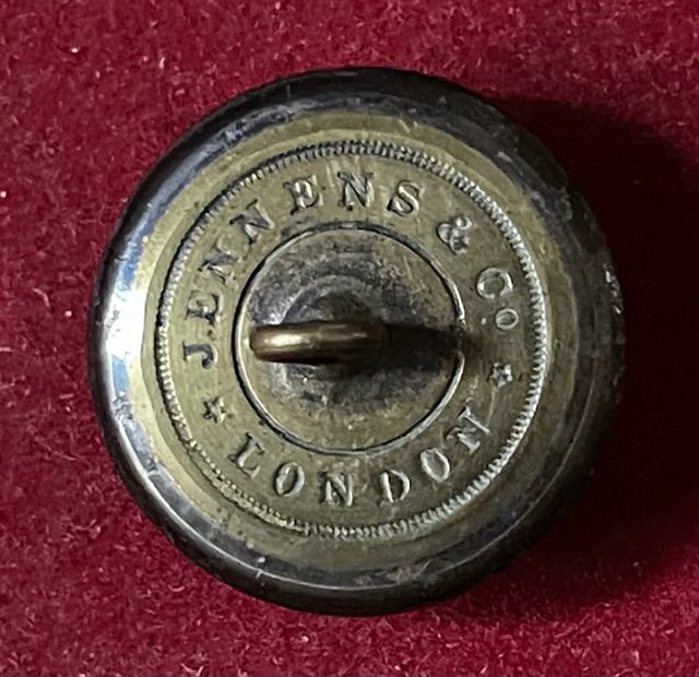 A 25mm silver plated, officer’s tunic button of the 3rd (Light Infantry) West York Militia with design of the rose within the light infantry strung bugle with crown above. It has the backmark JENNENS & Co. LONDON. The button is illustrated in Ripley & Darmanin: English Infantry Militia Buttons 1757-1881 [293] where it is noted that the button was also worn by the 4th Royal Lancashire Militia. Another button from my old private collection put together in the 1970s so the button has very dark toning as I do not clean buttons. oct11/2