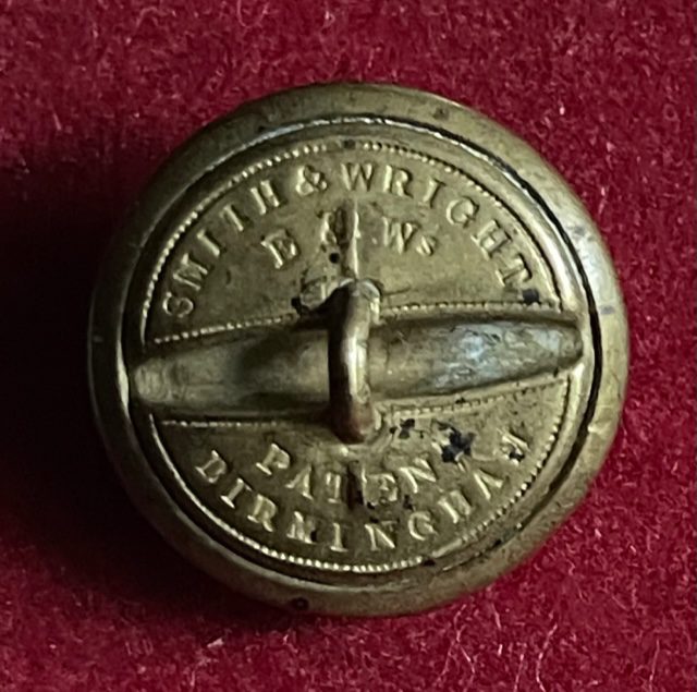 57th [West Middlesex] Regiment of Foot. brass 25mm button with the backmark SMITH & WRIGHT E &Ws PATENT BIRMINGHAM. This is the pattern worn from 1855 to 1881 when the regiment became known as the 2nd Bn. The Dorsetshire Regiment. The button has a few black marks between the numbers and to their right. I don’t remember seeing this patent before. sep28/4