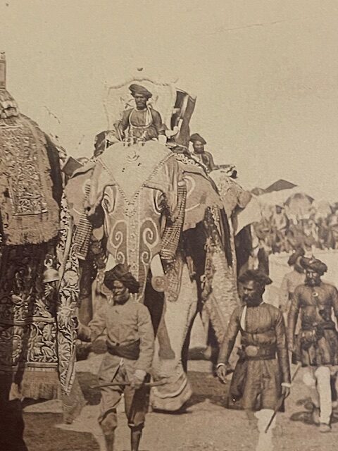 An interesting image from the 1877 Imperial Assemblage in Delhi, 11¼ x 8¼ visible phot image, showing richly decorated elephants that would be taking part in the grand display of Princes and high British officials in thamphitheatre. The fact that the howdahs are unoccupied suggests that this image was perhaps taken at a rehearsal, there are a notable number of photgraphers in the stand to the left. Attendantswalk alongside the elephants as they would in the parade. The original print was rather faded but the shadow to the lower part of my image is my own shadow. [I’m not as skilled as the original photographer.] feb11/1