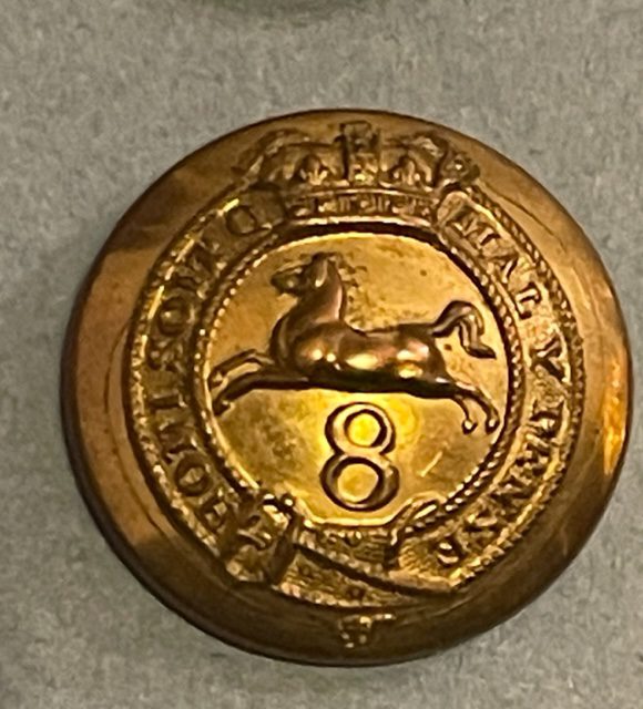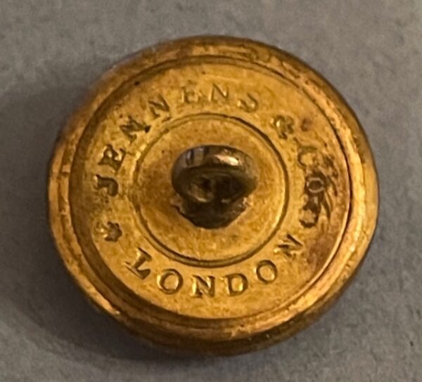 An very good example the officer’s 22mm gilt button as worn on the coatree of the 8th (The King’s) Regiment prior to 1855 The button, which has the backmark JENNENS & Co. LONDON, retains most of the original gilt finish with just a little rubbing on the high points of the design. On this example the white horse of Hanover appears within the garter facing left. There are also examples where the horse faces right for wear in pairs on the double breasted coatee. The design was largely retained on the post 1855 numbered tunic button although a wreath was added around the garter. It is one of the scarcer buttons in this series. After 1881 the regiment became The King’s Regiment (Liverpool) and was later amalgamated with the Manchester Regiment. oct7/1