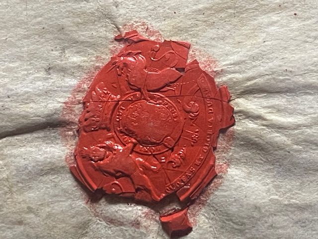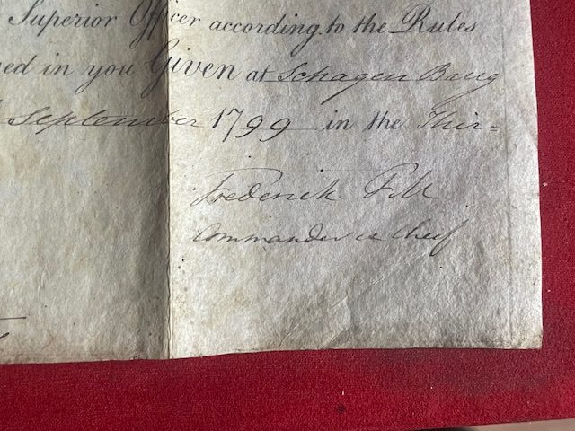 The 18 x 9 ins. commission appoints Lieutenant James Malone of the Half Pay of Late 3d. Irish Brigade …Lieutenant in the 4th /or King’s Own Regiment of Foot and is dated Eighteenth Day of September 1799 in the Thirty Ninth Year of His Majesty’s Reign. It is signed lower right Frederick, Commander in Chief and further signed to the lower left Robert Brownrigg, Secty. The paper is rather age marked and there is a crease across the lower left corner. It is not brittle.A red wax royal seal impression is affixed top left. feb24/5