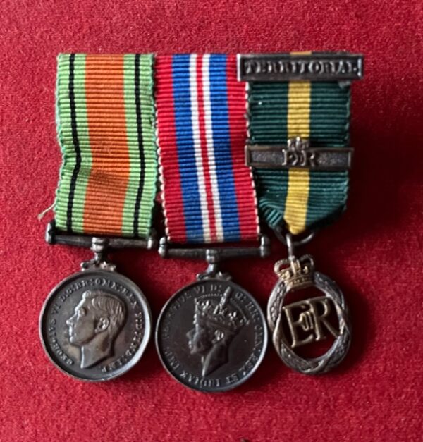 A group of three miniatures mounted as worn with original ribbons, comprising, 1939-45 Defence Medal. War Medal, Territorial Decoration [EIIR] with second award bar. The TD has its correct TERRITORIAL top bar for a British award. The medals are all very fine examples, possibly silver, and nicely toned. no28/4