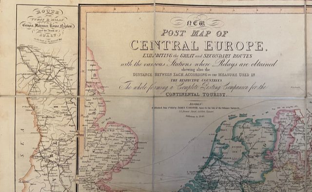 New Post Map of CENTRAL EUROPE, exhibiting the great and secondary routes with the various Stations where Relays are obtained, showing also the Distances between each according to the measure used in the respective Countries. The whole formoiomg a Complete Posting Companion for the Continental Tourist. James Gardner, 33 Brewer Street, Golden Square, London.1827 with additions to 1840.
