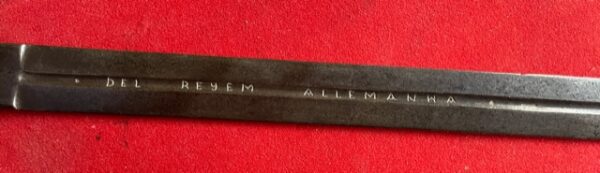 The sword has a 36 ins straight blade, terminating in a spear point, the shortish single fuller engraved on each side with the wording DEL REYEM ALLEMANHA. There are further marks on the forte of S in a shield and a monogram MM. The cast hilt is quite effective but suggests a decorative origin. aug22/4