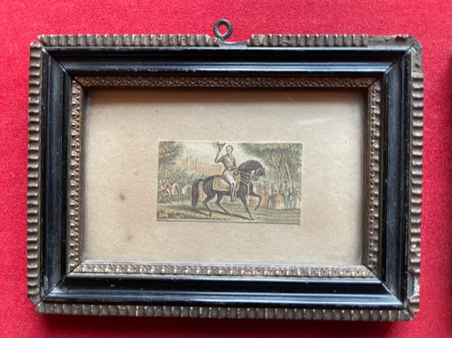 The attractive and decorative little group of four needle case prints date from around 1850. each print in its frame measures approximately 4¾ 3½ ins and the frasmes are probably contemporary. They show Prince Albert in uniform doffing his plumed hat to well wishers, Queen Victoria and her consort riding in Scotland, a view of Balmoral Castle, and the Royal Yacht Victoria and Albert. Prince Albert bought Balmoral for the Queen in 1852 but they had leased it for some years before that. dec27/3