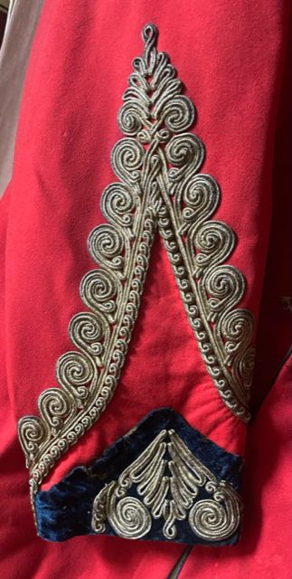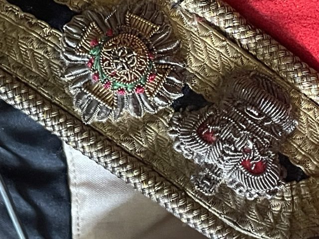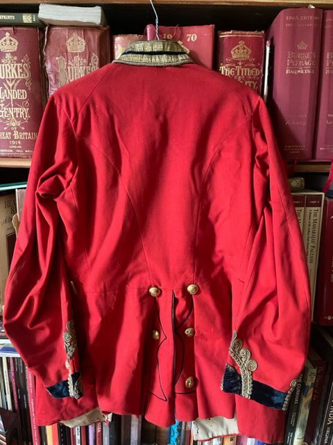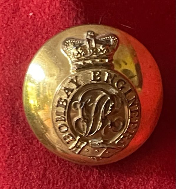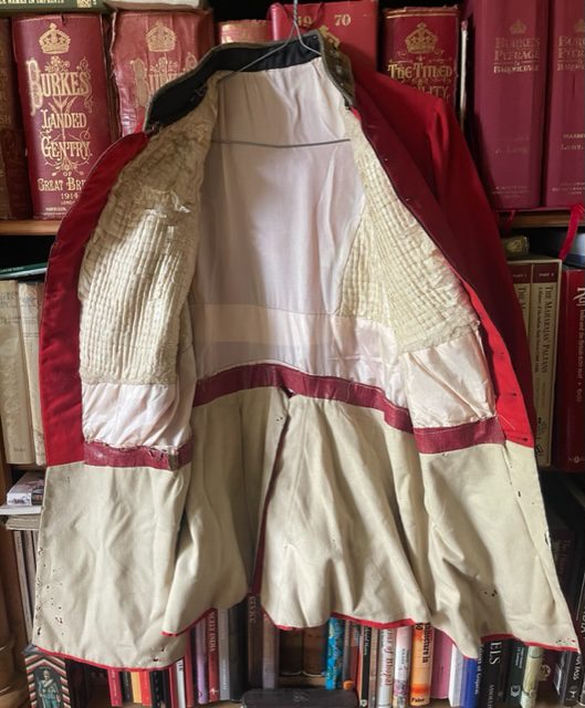 The scarlet tunic of the Bombay Engineers has dark blue velvet facings and two rows of gold lace to the collar with the rank badges of a crown and Bath star, with the ornate gold lace sleeve decoration. It retains only five of the original six buttons to the tails of the tunic and none of the nine which would have been down the front. Although the red melton cloth of the tunic shows none of the usual moth or insect damage, the quilted parts of the lining are quite worn. It has a pocket to the inner left side and two deep ones in the tails. The tunic measures 14 ins between the shoulders at the back and 28 ins from the base of the collar to the bottom of the tails. The rank badges to one collar date this to before 1880 and the rather long style suggests somewhere nearer to 1860. oct8/1