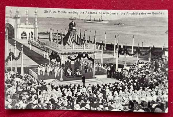 Sir P. E. Mehta reading the Address of Welcomeat the Amphitheatre – Bombay. A good, unused postcard showing Their Majesties seated in front of temporary welcoming arch bearing quite a resemblance to the present day Gateway to India in Mumbai. This was the first and only visit to India by a ruling King Emperor and the couple were of course on their way to Delhi for the great Coronation Durbar in December 1911. aug13/2