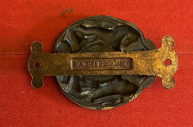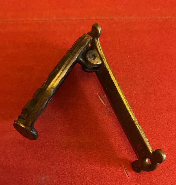The sturdy brass door knocker has a slightly modified version of the Royal Arms [probably to avoid copywrite problems] and judging from the ER 1953 above the crown this was probably made as a coronation souvenir. The arms measure 58 x 68mm and it is hinged to a plate stamped, very honestly, on the back MADE IN ENGLAND. An amusing present for a Royalty collector perhaps. mar13/1