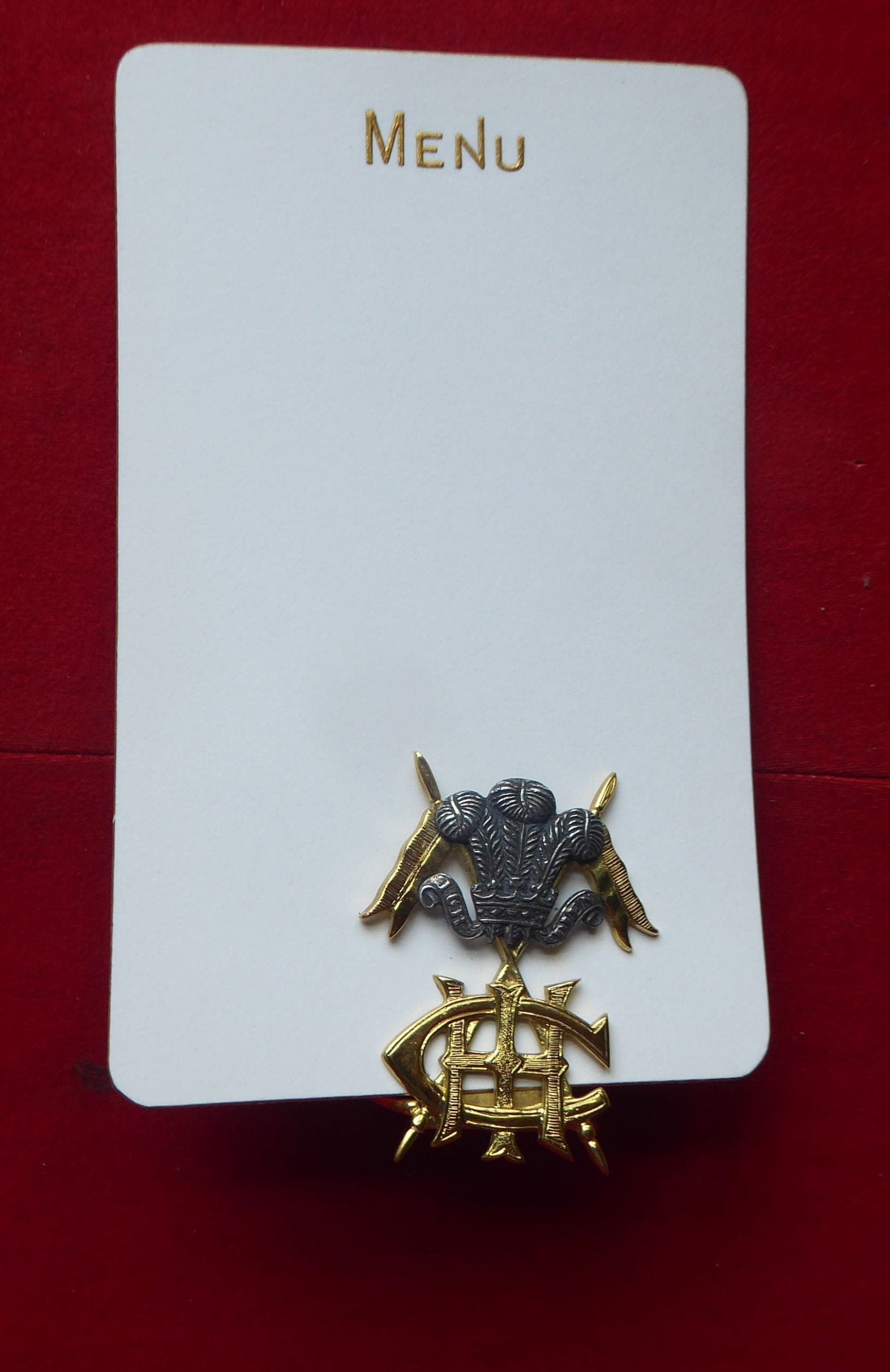The gilt brass and white metal or silver menu holder takes the form of the badge worn by officers on the pouch with the Prince of Wales’s feathers above the regiment’s initials CIH on crossed lances. The overall size is 53 x 42mm. jun15/7