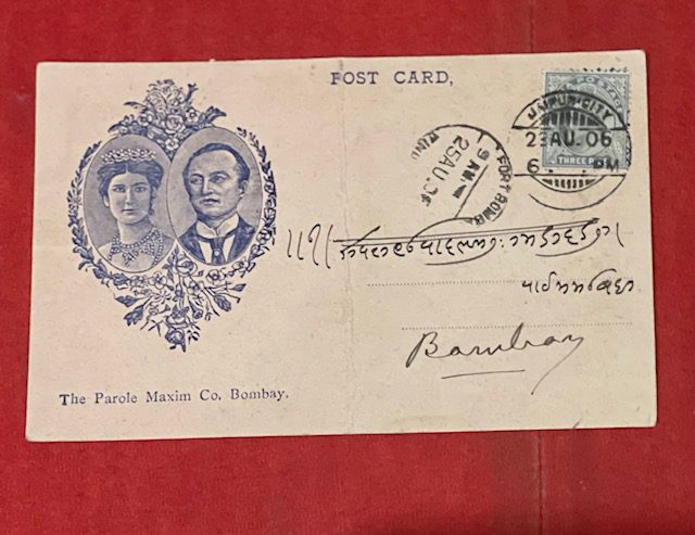 The simple Edwardian post card with an image of Lord & Lady Curzon above printed  origin The Parole Macim Co. Bombay. The card, which has light vertical fold, has been postally used with the cancellation stamp JAIPUR CITY 23 AU 06 and next to it is a receiving stamp PORT, BOMBAY 9A.M. 25 AU 06. The address, apart form the word Bombay is in local writing as is the  message on the reverse. oct30/3