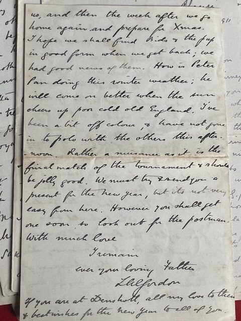 2. Also 29th December on four pages Mrs Gorsdon writes, impressed that father drove normally at 30 -35 miles an hour and remarks When we got here we found the Camp all beautifully arranged by Captain Nevill [Capt. H.L. Nevill,D.S.O. 2i/c to Gordon]. She notes their camp is miles from the city but is also impressed by the Princes’ Camps, observing that the Kashmir camp’s tent poles are silver, and gold and silver chairs, and the sides of the tent are hung with priceless Cashmere shawls, centuries old. The roads are full of the weirdest people, heaps of motor cars, then a Prince with his escort of cavalry in gorgeous uniform & lances with pennnons -wonderful carriages with outriders, ladies in their smartest frocks … just like Bond Street or Piccadilly. She signs herself your loving Mother.