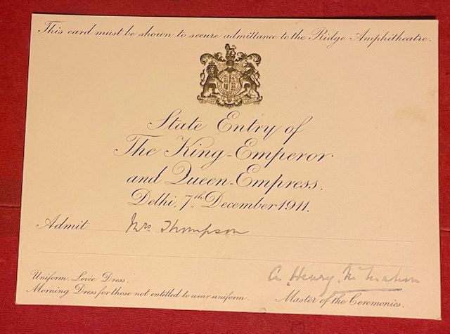 State Entry of the King Emperor and Queen Empress Delhi 7th December 1911. The invitation is printed on 7 x5 ins [17.5 x 11.5 cm] card embossed in gold with the Royal Arms. The card is in excellent clean condition ans is made out to admit Mrs. Thompson . The State entry took place after the arrival of Their Imperial Majesties by train at 10 a.m. on the first Thursday of the Durbar. jan14/1