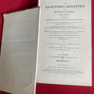 The East India Register and Directory for 1842; containing complete Lists of the Company’s Servants, with their respective Appointments; with Indexes to the Same, and Lists of Casualties….Births, Marriages and Deaths in India…List of the Proprietors of East India qualified to vote … compiled by Permission of the East India Company…by F. Clark of the Secretary’s Office, East India House., Second edition, corrected to the 11th May 1842. Wm, H. Allen [London] 1842 small 8vo.