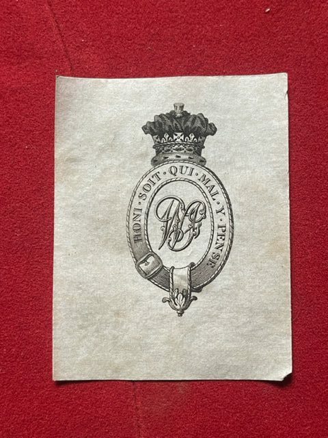 GLOUCESTER. The 80 x 60mm bookplate shows the monogram WF within a garter surmounted by a Royal coronet for Prince William Frederick, Duke of Gloucester [1776-1835], the only son of Prince William Henry, Duke of Gloucestrer and Edinburgh and brother of King George III. The Prince was born at Teodoli Palace in Rome and died at Bagshot Park in Surrey, the current home of H.R.H. Prince Edward, Duke of Edinburgh. There is a very small loss to the tip of the lower right corner. An oval version of this bookplate is illustrated in Brian North Lee: British Royal Bookplates [Scolar Press 1992] p.180. dec17/2