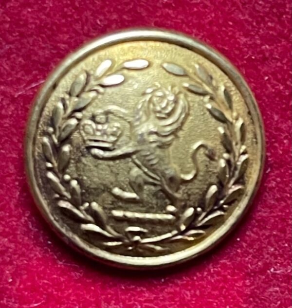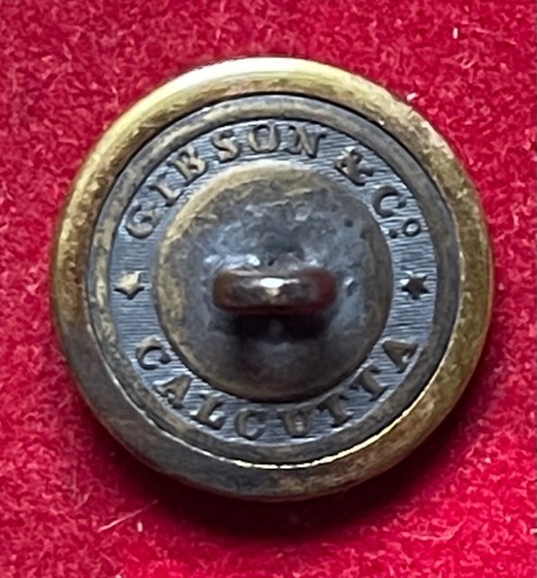 This fine gilt button of the Governor General’s Body Guard is 22mm and has the backmark GIBSON &Co. CALCUTTA . It conforms in general design to the one illustrated in Ashok Nath: Izzart. Historical Records and Iconography of Indian Cavalry Regiments 1750-2007. [New Delhi 2009] in showing the crest of the East India Company within a wreath of laurel. It is illustrated on p xvi of the book and noted as the earliest known example. We have an example of that button illustrated in this category but the present one differs in being of flatter style, having a rim, and showing the torse on which the lion stands in quite a different form. It generally has an earlier style. The button retains virtually the full original gilt finish. Although we have not seen this maker / retailer on other buttons the name is found on the blades of some early 19th century swords. oct11/1