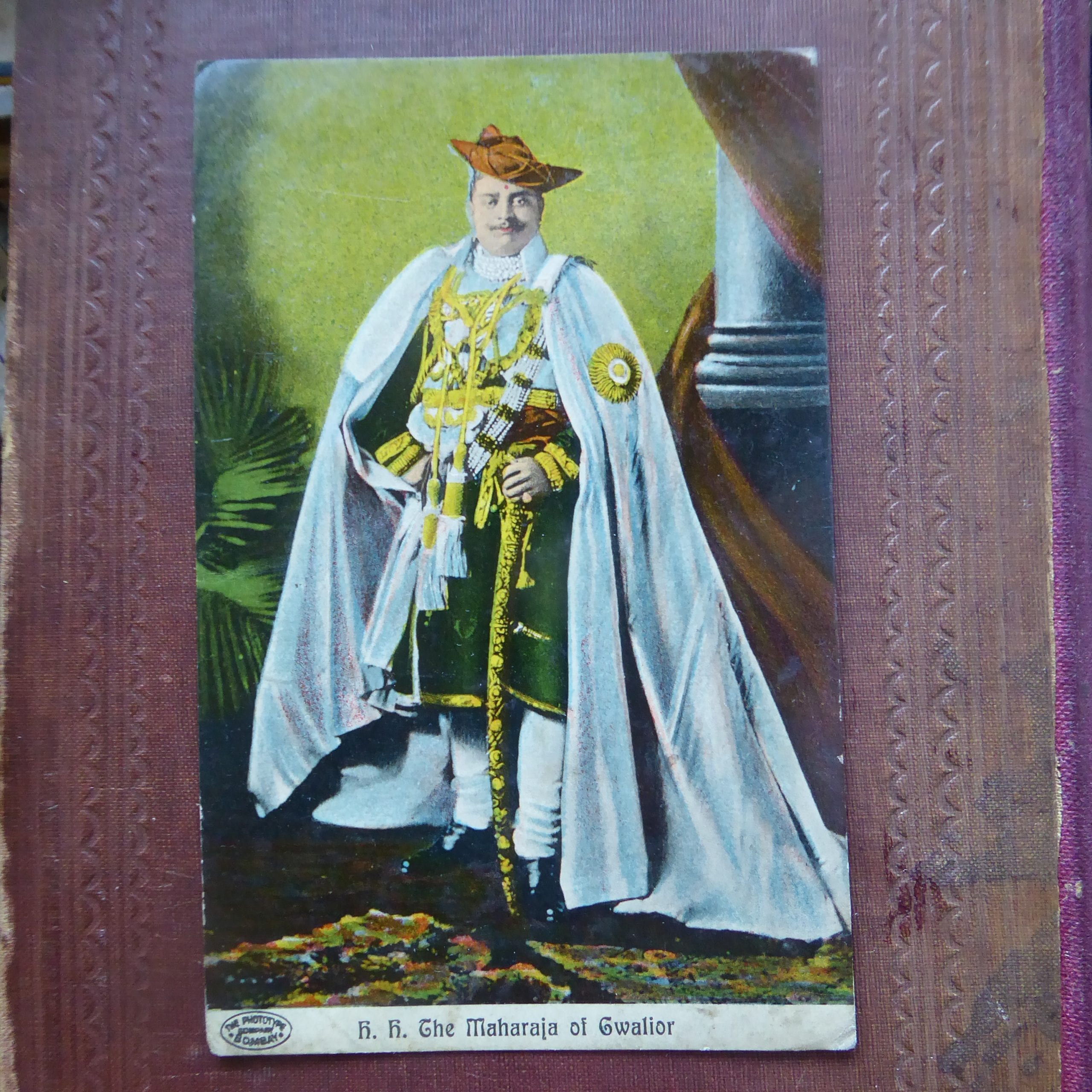 A coloured postcard showing the Maharaja in ceremonial dress wearing the mantle of the Most Exalted order of the Star of India. The unused card is by The Phototype Company, Bombay. may9/2