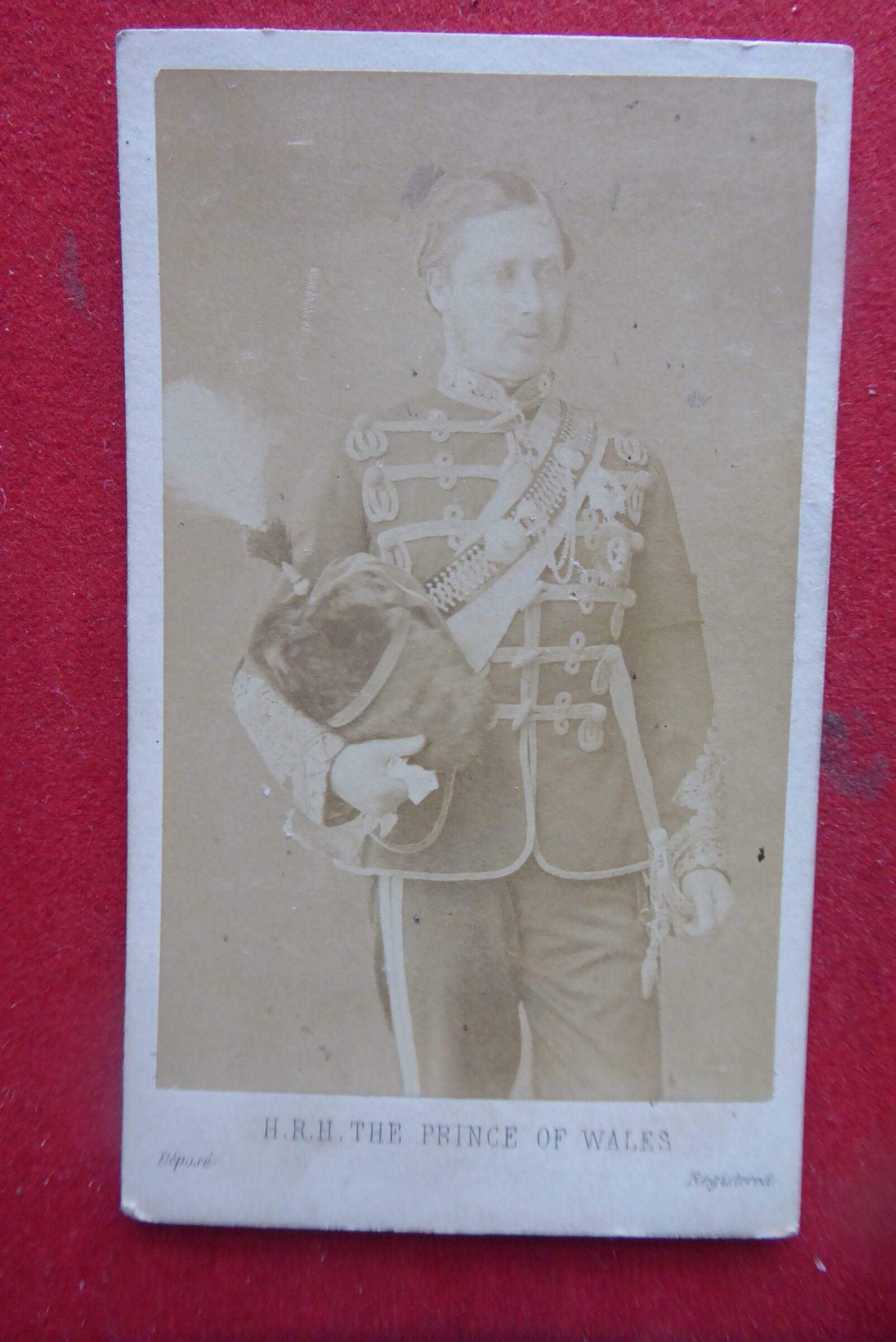 A good if somewhat faded three quarter length carte de visite portrait of the Prince of Wales [later the first King Emperor of India Edward VII] by Bingham, Inventeur du procede collodion in which he wears the dress uniform of the 10th (The Prince of Wales’s Own) Regt of Hussars, probably circa 1864-8. the Prince was Colonel of this aristocratic regiment from 1858 and here he wears the star of the Order of India. He was awarded an original KSI in 1861 and a GCSI on the enlargement of the Order in 1866. An advertisement on Bingham’s card notes their medal won in 1862. mar31/2