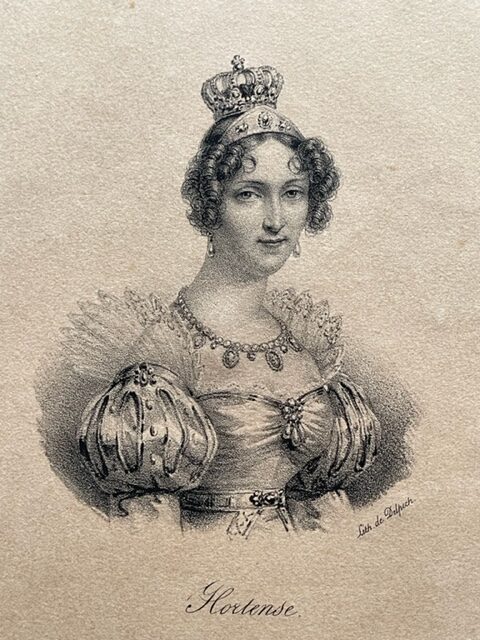 A lithographic bust length portrait of the step daughter of Emperor Napoleon I, Hortense de Beauharnais [1783 – 1837 ] whom Napoleon married to his brother Louis Napoleon who was King of Holland. The bust length portrait of the Queen Consort , marked Lith de Delpech, is on paper measuring 10¾ x 8½ ins and mounted on old card. Although undated, a contemporary slip of paper attached notes the date of this royal gift: Donné par la Reine Hortense à Mlle.Mamer le 4. 8bre 1836. oct19/4
