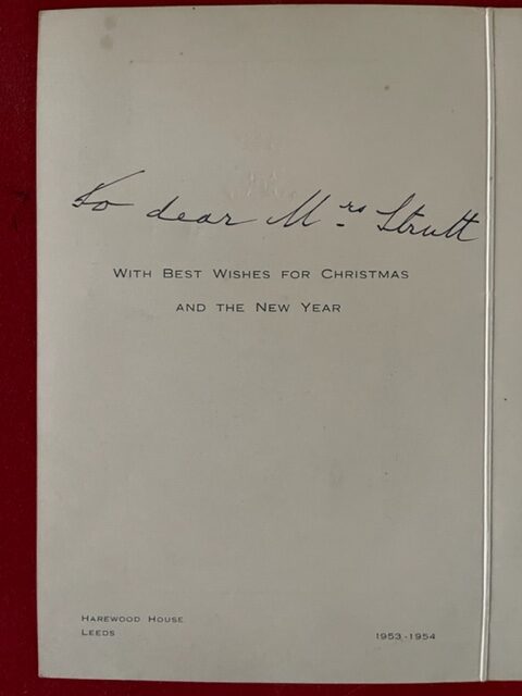 The 8 x 6½ ins Christmas card displays the crowned M embossed in gilt and inside has a hand written dedication To Dear Mrs Strutt on the left side, facing a formal portrait of the Princess, 6 x 3 ins, signed beneath Mary. In the portrait the princess wears the dress and jewels she wore for the 1953 coronation and the insignia of Dame Grand Cross of the Royal Victorian Order with her four Family Orders of Edward VII, George V, George VI, and Elizabeth II. This formal portrait is unusual for her Christmas cards which usually have much less formal images of herself with her family or in various roles of public service. feb11/2