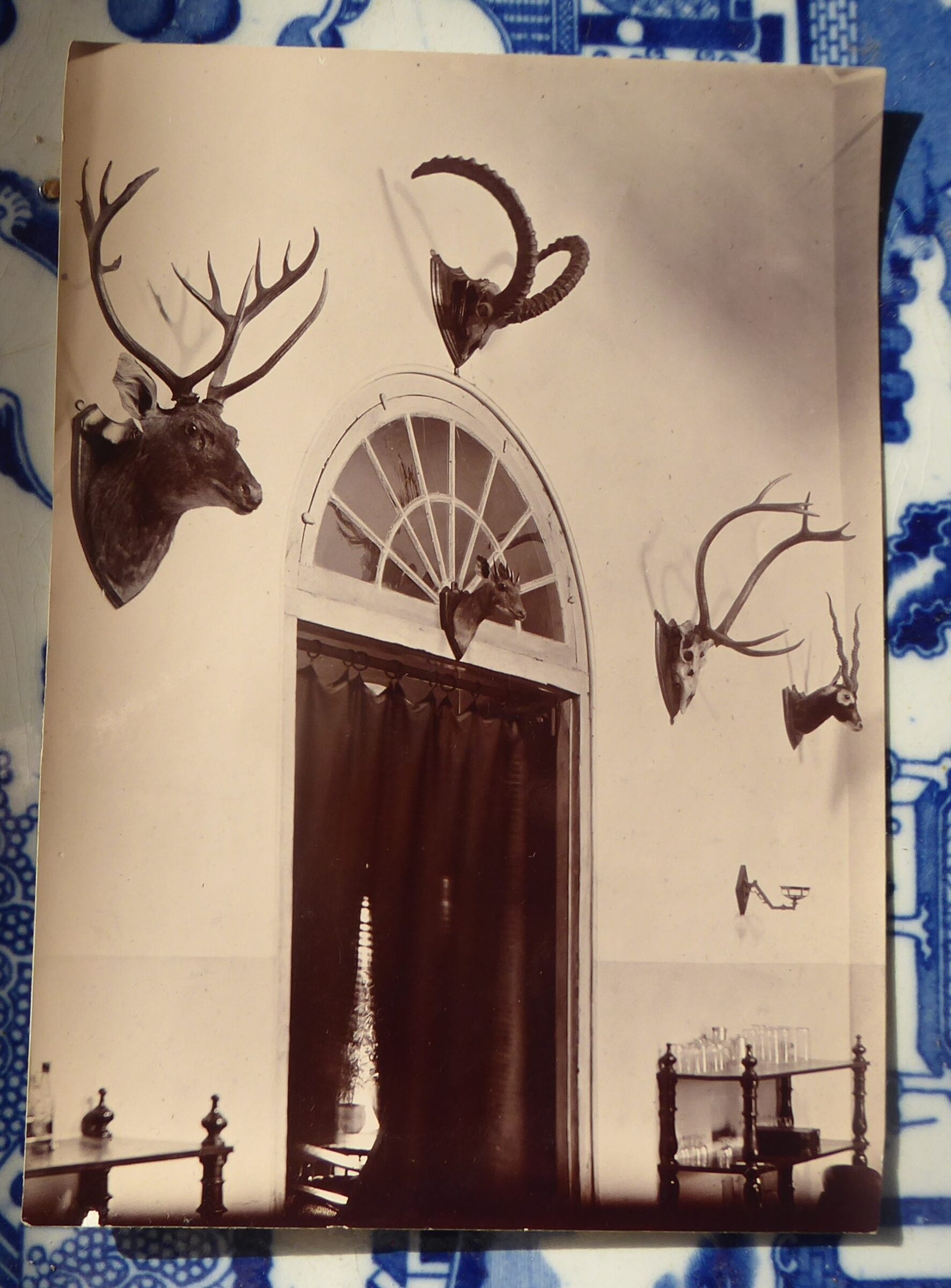 A small vintage photograph taken by or for Lt Col Peter Bairnsfather, the Commandant of the 14th Bengal Lancers, a regiment based at Sialkot. The 5¾ x 4¼ ins photograph shows a corner of the mess dining room with several sets of horns and taxidermy heads on the walls around a door and probably dates form the 1890s. Bairnsfather was the author of Sport and Nature in the Himalayas [1914] and contributed to other books on hunting and fishing in the region. sep15/2 Reserved