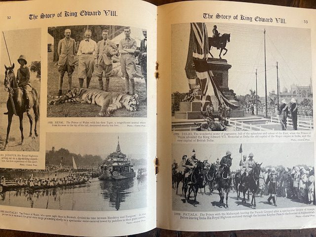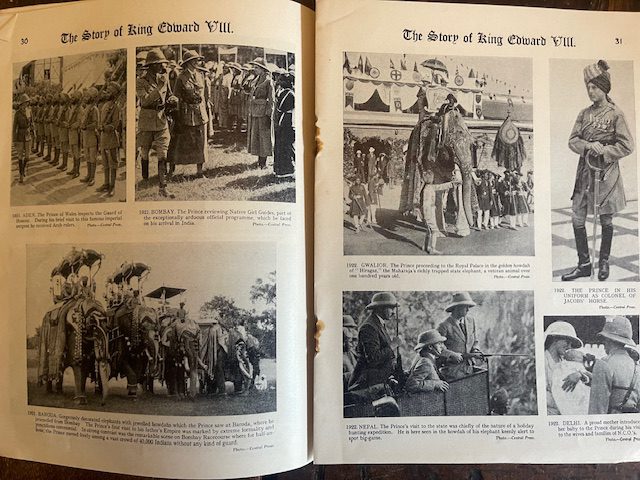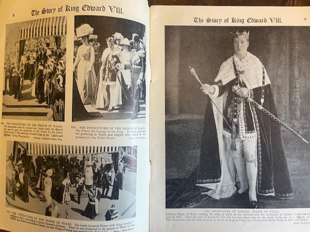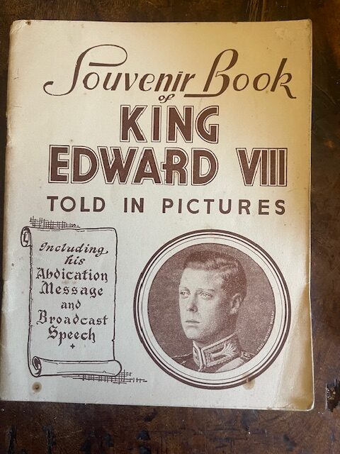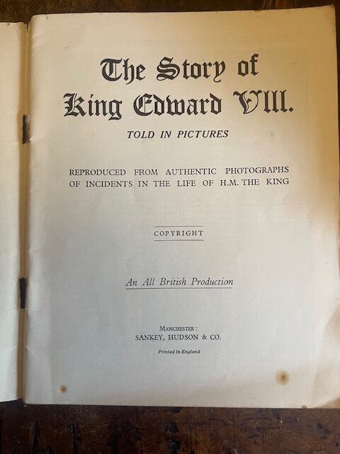 Souvenir Book of King Edward VIII told in pictures. Including his Abdication Message and Broadcast Speech. Sankey, Hudson & Co. [Manchester] n.d. 8½ x 6½ ins. 64pp with monochrome illustration, original decorative covers, stapled as issued, the staples rusted with the cover and the central page detached, otherwise clean. Included with the booklet is a separate 8 x 6 ins three quarter length printed portrait on photographic paper ahowing Edward in naval full dress with medals and orders, identified in the negative as being by Bassano. An interesting ephemeral survival with lots of useful images, especially of the Royal Tours such as that to India and beyond of 1921-22. mar24/1