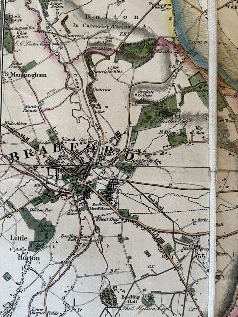 A large folding map, linen-backed and coloured, on a scale of approximately 2¾ inches to 1 mile, extending unfolded to 49 x 46 ins, folding down to a size of 9½ x 6½ ins. The map, edged with green linen retians its original marbled paper covered endpapers but has no slip case. An excdeptonally attractive and informative map of this area of west Yorkshire, extending from Harewood, Leathley, and Otley in the north to Dewsbury and Wakefield in the south, and from Bradford and Cleckheaton in then west to Bramham,. Aberford, and Castelford in the east. The lower left corner has an engravig of the the Cistercian Kirkstall Abbey in Leeds. Printed at the very beginning of the railway age the map shows the first impressions on the landscape as the Parliamentary Line of the Leeds and Selby Railway and the proposed Leeds and Bradford Railway: otherwise this is still the largely rural lanscape of the late industrial revolution. One of the most interesting features of this map is its showing the names of owners of the major estates. These incliude: Rev Richard Ridley, Rev. A Fawkes, Jas Dinwiddie, Earl of Harewood,John Wormald, Rev. J. A. Rhodes, Thos Benyon, Sir John Beckett, Mrs Nicholson, John Shadwell, G. Lane Fox, R. O. Gasgoigne, Marchioness of Hertford, G. Wright, Benjamin Gott, Col. J. A. Tempest, John Hustler, Sir John Lowther, J. Brandling, John Blaydes, Earl of Mexborough, J.B.D. Bland, Francis maude, Arthur Heywood, Sir Edward Dodsworth, Henry Leah, Henry Dawson. Many of these names still crop up in local society and the names of several are attached to important, now public parks. We also have a copy of the 1849 edition which shows the progress the railways have made.