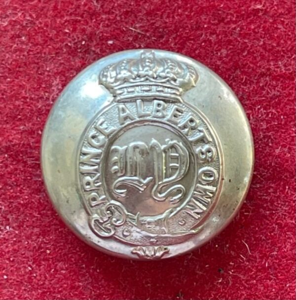 A good example of the white metal 24mm button worn in late Victorian times with the Gothic initials L Y wih the wording PRINCE ALBERTS OWN in a garter, all beneath the Prine Consort’s crown. The backmark is FIRMIN LONDON. mar27/1