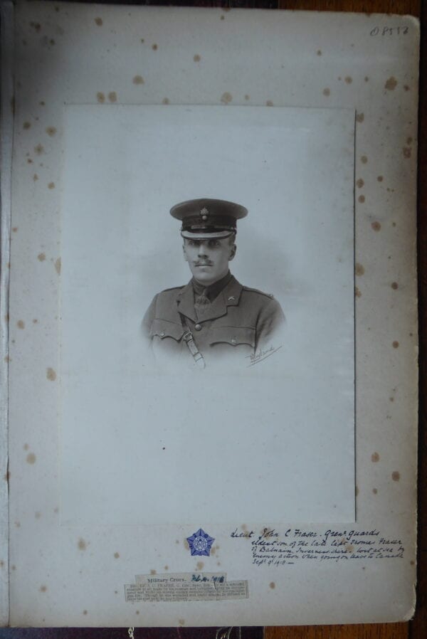Lieutenant John C Fraser, M.C. Grenadier Guards & Guards Machine Gun Corps. A good photographic portrait of the officer, bust length, wearing service dress uniform with Grenadier Guards cap badge but with collars indicating that he was serving with the Guards Machine Gun Regiment – a very short lived unit towards the end of the First World War. The photograph [image size approx 4 x 4ins] is on photographer’s card signed in the negative Wayland [10 x 6.5ins] further mounted on a stout card album sheet. On the album sheet is a cut out regimental badge in blue, a contemporary manuscript note Lieut John C Fraser, Gren Guards, eldest son of the late Capt Thomas Fraser of Balmain, Inverness-shire – lost at sea by enemy action when going to Canada on leave, Sept 9th 1918. A pasted small newspaper obituary notices on the card states that he won his MC for fighting off several enemy attacks with his machine gun earlier in 1918. There is some spotted foxing to the album leaf [which is blank on the reverse] but the photographic card is in excellent condition. oct4/1 SOLD 9th April 2024