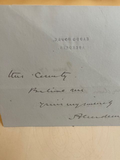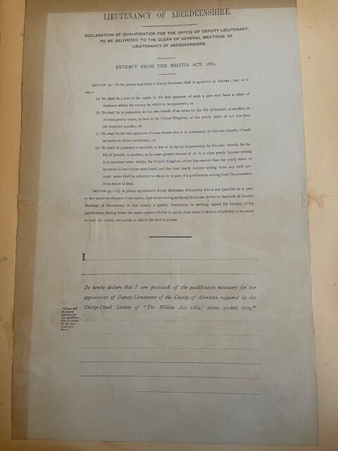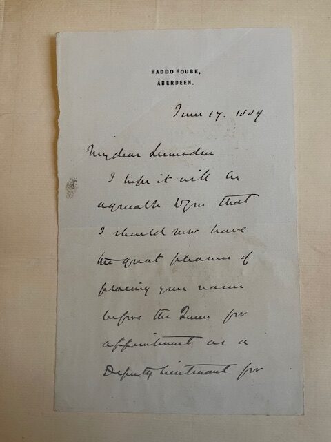 A personal letter in his own hand from Sir John Campbell Gordon, 7th Earl of Aberdeen to General Sir Peter Stark Lumsden seeking his agreement to having his name placed before the Queen for appointment as a Deputy Lieutenant for the County. Written on a single sheet of writing paper embossed HADDO HOUSE, ABERDEEN and dated June 17 1889 it is addressed to My dear Lumsden and signed Aberdeen. It is tipped to an old card album sheet and is accompanied by another sheet with a printed folio sheet titled LIEUTENANCY OF ABERDEENSHIRE with an extract from the Militia Act of 1882. feb15/4