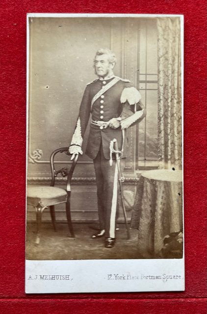 A good carte de visite by London photographer A. J. MELHUISH, 12 YORK PLACE, PORTMAN SQUARE showing a full length portrait of a lieutenant colonel in dress uniform, holding his cocked hat and wearing a sword. The rank badge on the collar dates this cdv to before 1881. The lace on his uniform shows him to be a Royal Engineer. jan17/4