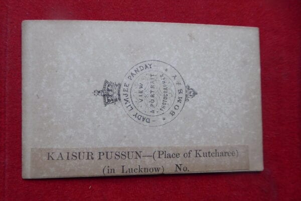 Two good sepia toned carte de visite photographs, 4 x 2½ins, of the Kaiserbagh Palace complex, built in the late 1840s under the rule of Nawab Wajid Ali Shah. The cards are by Dady Limjee Panday, View & Portrait Photographer, Bombay and as well as the photographer’s credit on the verso there is a contemporary printed label reading, in the case of the upper image Portion of the Kaiser Pussun (in Lucknow) No 17 and in the lower Kaiser Pussun – (Place of Kurcheree) (in Lucknow) No. Panday opened his studio in 1870 and this image, together with a few others we have to offer, probably dates from soon after that date. These two images are priced as a pair at £35 but can each can be bought singly for £20 if required. nov25/2