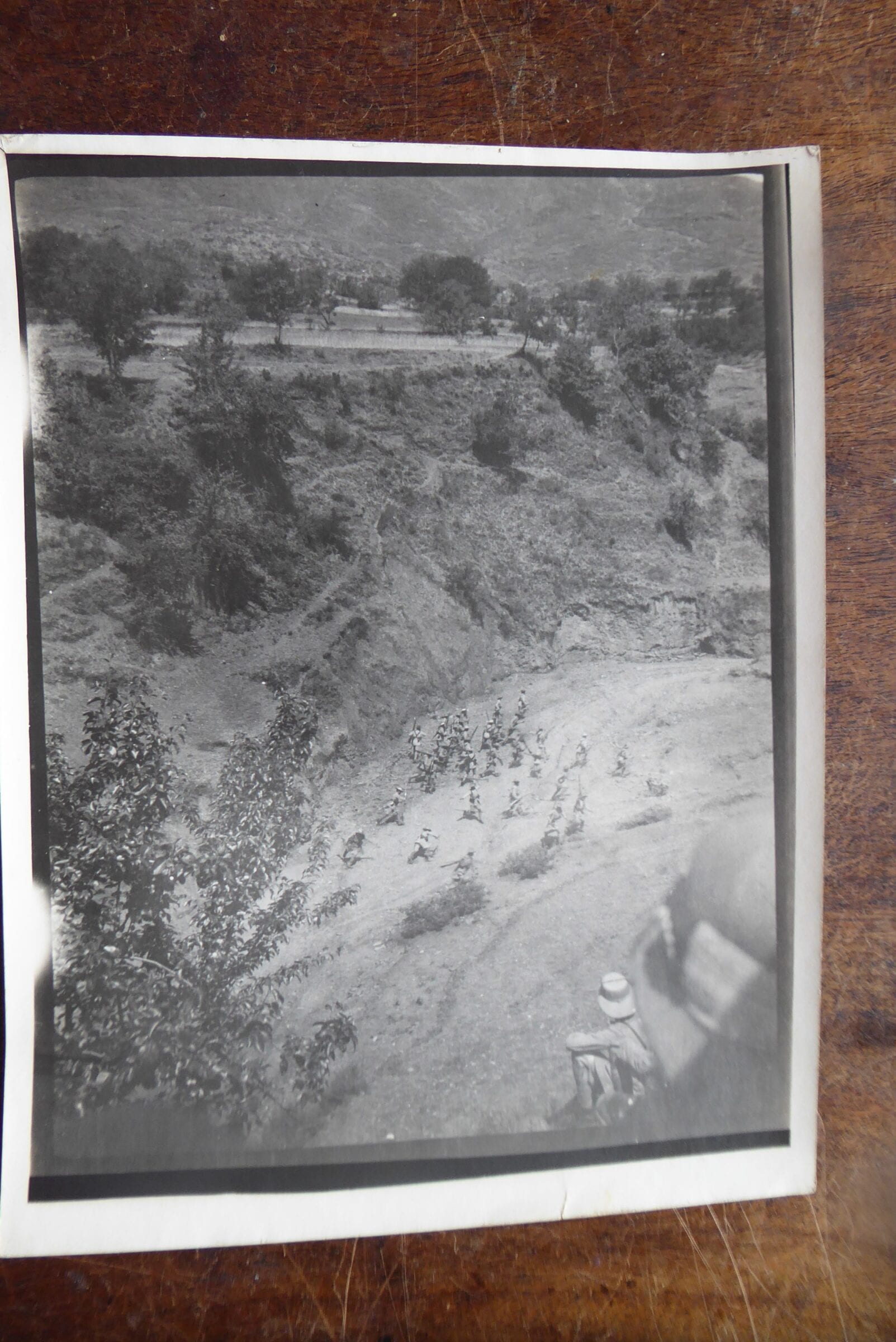 Four unusual photographs showing an exercise involving an ambush. Each measures 8½ x 6½ ins and they are possibly aerial photographs. One of the images shows a large number of soldiers observing from the hill top. aug5/2