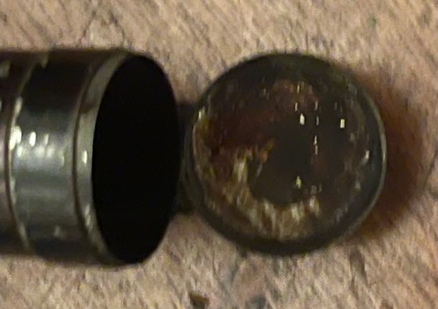 A military officser’s japanned metal plume tin, The tin measures 11 x1¼ ins and has a lid at each end, both in good working order. There is some scatching to he paint and two very mall dents commensurate with use. nov12/2