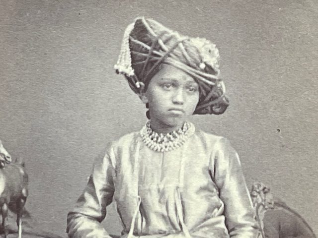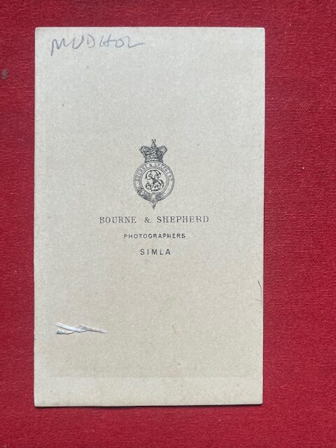 The very good carte de visite of Vyankatrao II, Chief of Mudhol [1861-1900] by Bourne & Shepherd, Photographer, India shows the pensive looking ruler of this state in northern modern Karnatika, probably taken in the 1870s. He is shown full length and wears a Maratha style turban and carries a sword and scabbard of British or certainly European style. The state received a nine gun dalute status in 1922. apr14/1