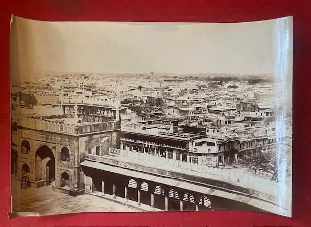 A very clear late 19th century photograph, 11 x 7¾ ins, taken from a high point of the Jamma Masjid showing the crowded architecture to the left of the traditionally viewed processional way from the Red Fort to the Mosque. The photograph is unmounted and has been rolled for many years but is in good condition with just a small tear at the lower right corner. feb15/1