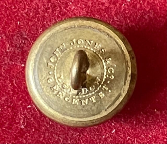 An officer’s 19mm gilt button of The Royal Muster Fusiliers of the pattern worn from 1881, before which date it was the 101st Foot. This example has the backmark JOHN JONES & Co. 6 REGENT ST. LONDON.