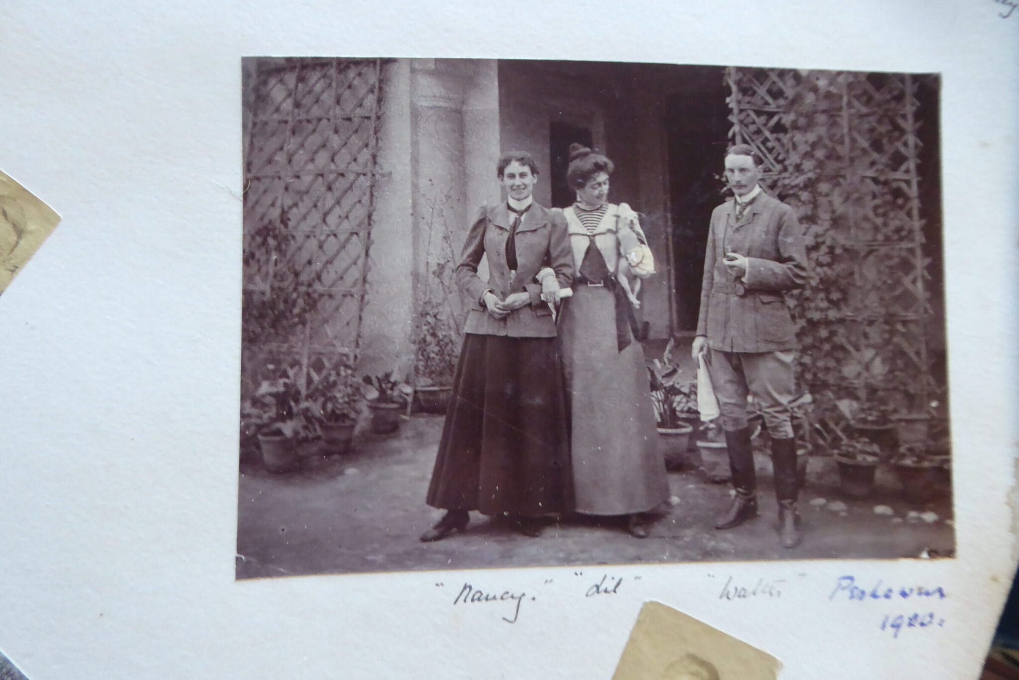 The amusing full pl½ate photograph, 11½ x 8½ ins, shows the group of five officers wearing tail coats, gorgets, and wigs outside an Indian verandah. Four are identified on the old album card as Col Abercrombie, Major Rose Keppel, Capt Burgoyne, Capt Douglas Smith. The reverse odf the card has a few small family portraits and two groups at Peshawar taken in 1898 & 1900. oct14/2