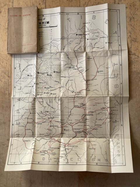 Large folding sketch map of Sikhim (bound in at rear, not in a pocket as in later editions), 3 folding sheets of profiles (Kanchenjunga group from Pamionchi, Everest range from Sandalkphu, folding road profiles), 136pp. Original buff card front cover with red title, rear cover, a little chipped, and paper spine are cleverly matched paper replacements. Contents generally very clean with large map, often missing, neatly folded, like the others. There is a faint vertical fold mark to the first half of the book which would probably disappear if placed in a press for some time. Small book plate to inside of front cover From the Library of Peter Hopkirk. Most of the copies of this title to be found are the 2nd, 3rd, and 4th editions which were produces between 1927 & 1944. The first is rather scarce.Oct15/3