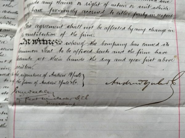 The Lungla (Sylhet) Tea Company Limited of the one part and Messrs. Andrew Yule of the other part. AGREEMENT as to the Agency of the Company in India. A hand written document of 1895 on both sides of three sheets of paper, 14½ x 9½ ins fastened with legal tape. The document concerns the appointment of Andrew Yule of Clive Row, Calcutta to be the Directors’ agent in India. oct1/12 RESERVED 31st January 2024
