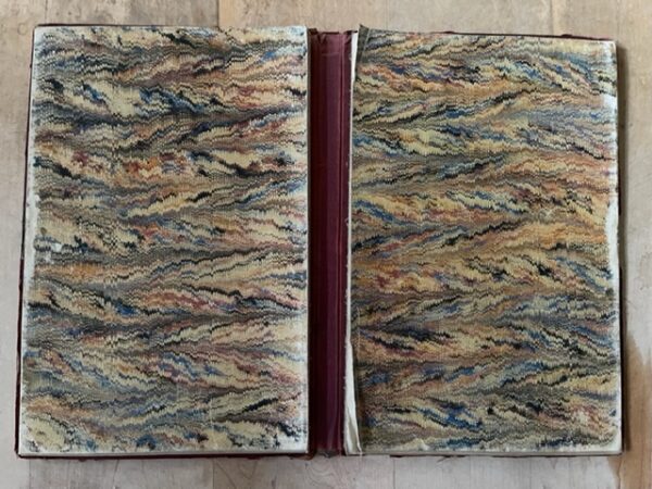 65 x 50 ins when unfolded, not including the gap between the two sheets which fold together into book form 4to [13 x 9 ins] red leather boards blind stamped and titled in gilt to the upper board within an ornate cartouche with the royal arms at the head and the arms of York at the foot. The binding is generally worn, especially on the spine where the joints are cracked, part of brass clasp remains on the upper board but is lacking from the lower. The coloured map divides the county into the old administrative divisions of Wapentakes, dating from pre Norman times. jan28/1
